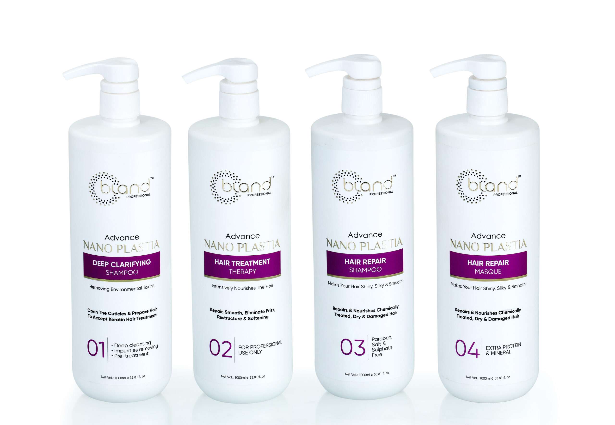 A complete salon-grade nano plastia treatment system designed to deeply cleanse, repair, nourish, and smooth dry, damaged, and chemically treated hair for long-lasting silky, frizz-free results.